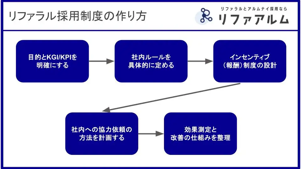 それでは、実際にリファラル採用の制度を構築するための具体的な手順を、5つのステップに分けて見ていきましょう。