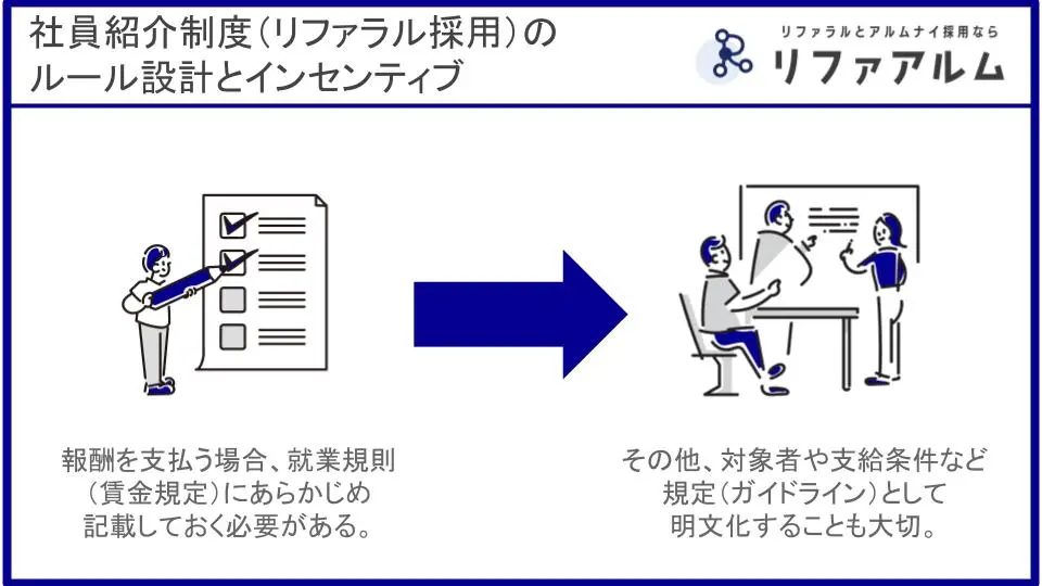 実際に社員紹介制度を導入する際、最も悩むのが「報酬」と「規定」です。法的なトラブルを避けるためにも、しっかりとした設計が必要です。