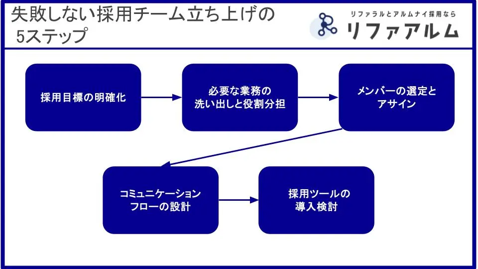 では、実際にどのような手順で採用チームを立ち上げればよいのでしょうか。失敗しないための5つのステップをご紹介します。