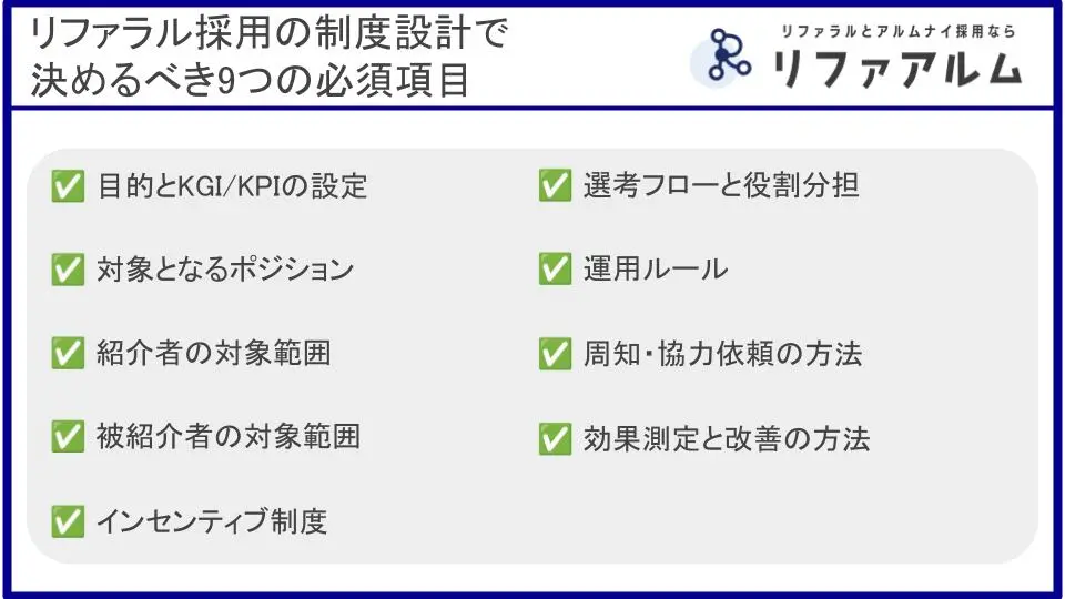 - 制度設計で決めるべき必須項目は、目的・KPI、募集職種、紹介者・被紹介者の範囲、インセンティブ、選考フロー、運用ルール、周知方法、効果測定の9つ