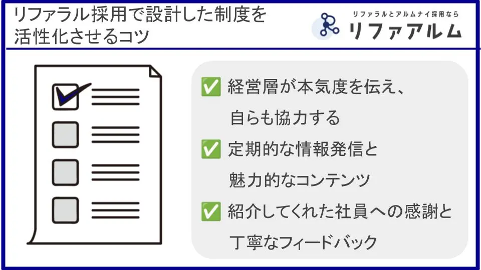 リファラル採用の成功は、社員の協力意欲を引き出す「戦略的な制度設計」にかかっています。