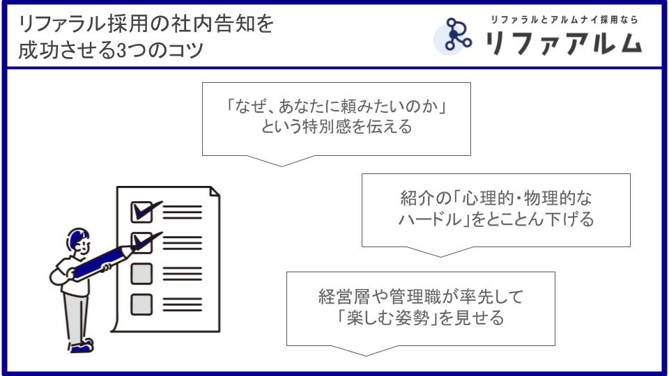 社内告知の進め方をご紹介しましたが、社員の協力度をもう一段階引き上げるための、より実践的な3つのコツをご紹介します。