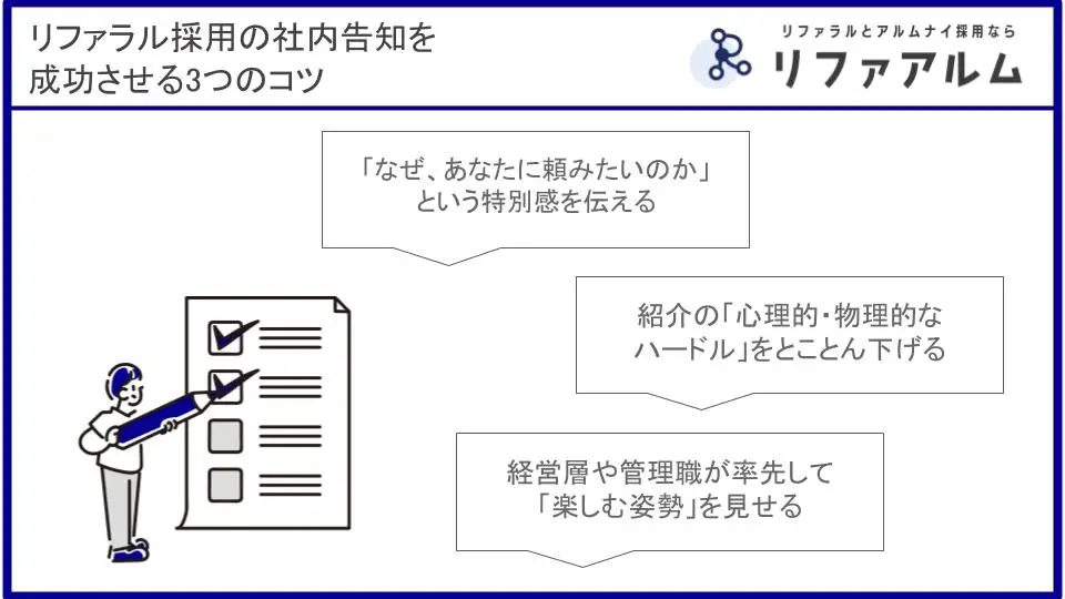 リファラル採用における社内告知は、単に制度が始まることを知らせるだけのものではなく、社員一人ひとりの当事者意識を引き出し、会社全体で採用を成功させるための、非常に重要な「戦略」なのです。