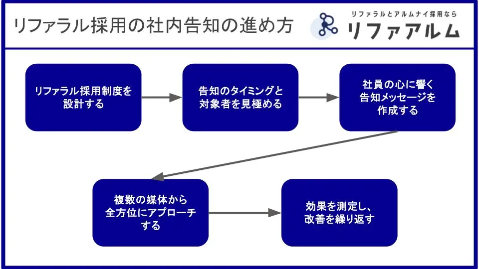 それでは、実際に社内告知をどのように進めていけばよいのでしょうか。ここでは、明日から実践できる5つのステップをご紹介します。