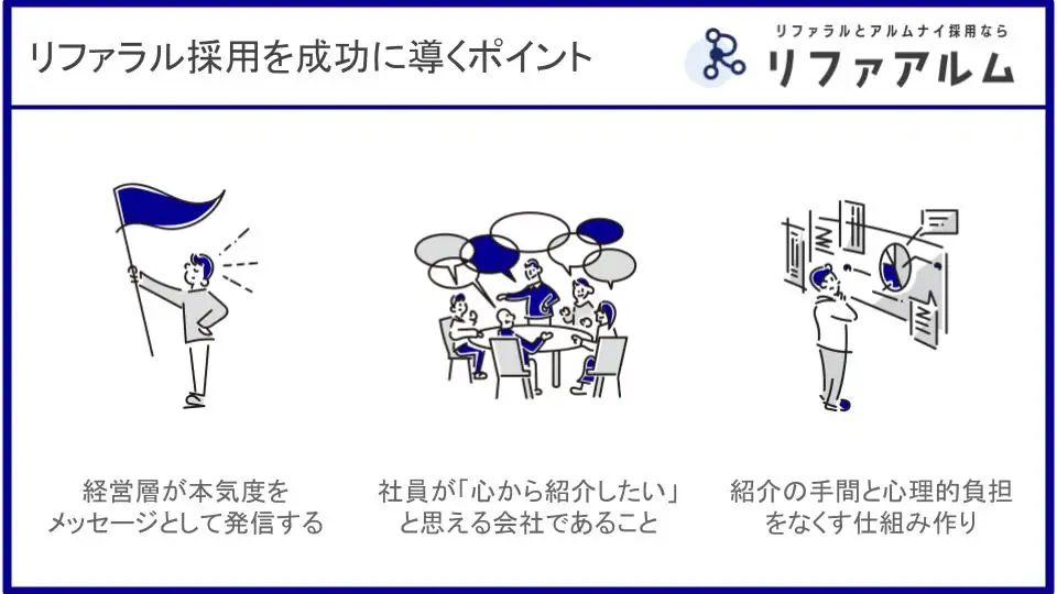 - 成功の鍵は、報酬だけでなく、社員が自社を好きになり、紹介しやすい環境を会社全体で創り上げることにある。