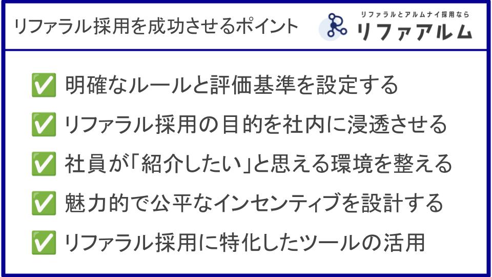 最後に、リファラル採用を形骸化させず、社内に正しく浸透・活性化させるための具体的な5つのポイントをご紹介します。