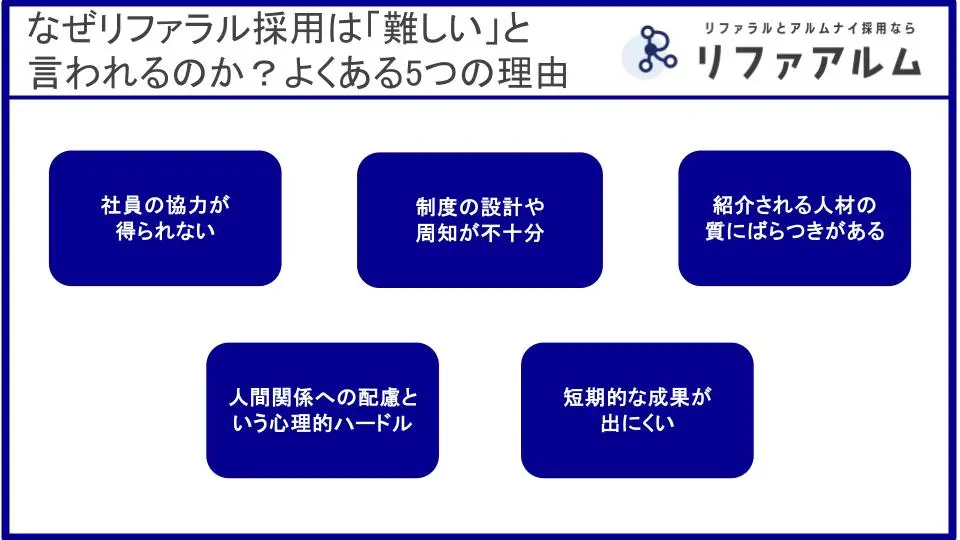 このように、多くのメリットがあるリファラル採用ですが、なぜ「難しい」と感じられてしまうのでしょうか。