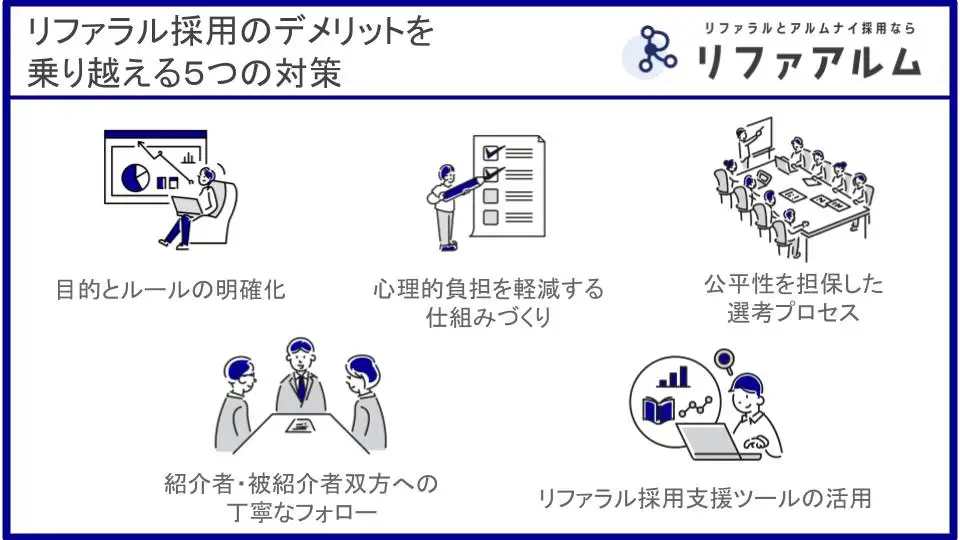 ここまで見てきたように、リファラル採用には様々なデメリットが潜んでいます。しかし、これらのデメリットは、適切な対策を講じることで十分に乗り越えることが可能です。ここでは、リファラル採用を成功に導くための5つの対策をご紹介します。