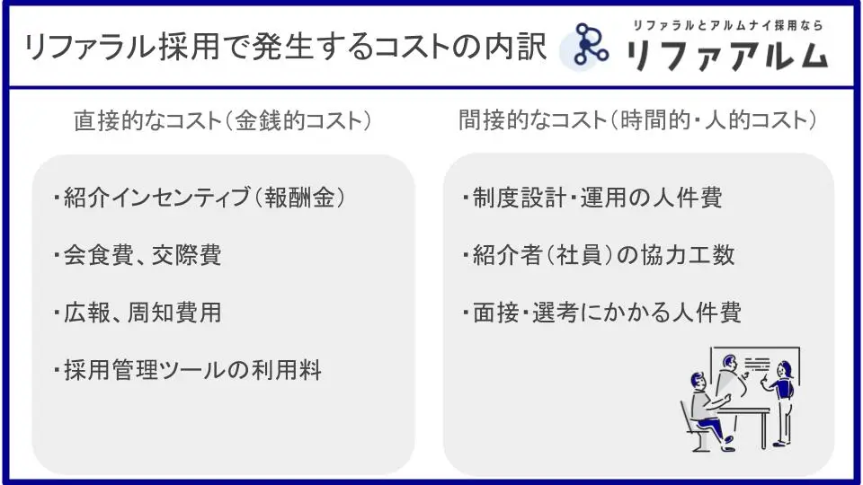 「リファラル採用は社員の紹介だから無料」というイメージがあるかもしれませんが、それは誤解です。実際には、直接的・間接的にいくつかのコストが発生します。