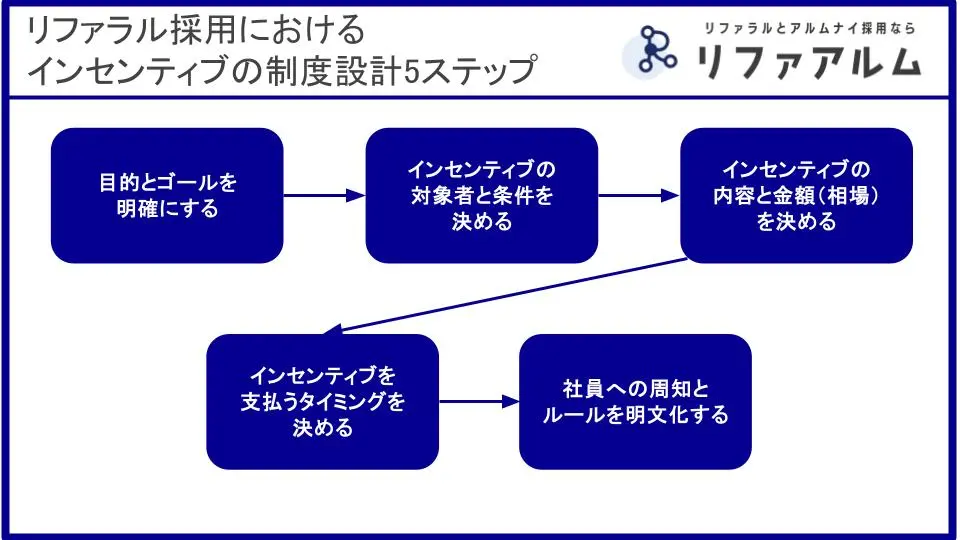 リファラル採用において、効果的なインセンティブ制度を設計することは非常に重要です。ここでは、具体的な手順を5つのステップで解説します。