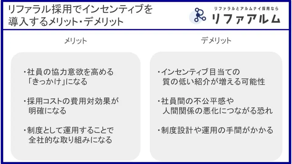 インセンティブがリファラル採用を活性化させる効果がある一方で、導入には慎重な検討も必要です。まずは、リファラル採用でインセンティブを導入するメリットとデメリットについて紹介します。