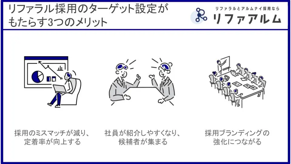 ターゲットを明確にすることで、社員は自信を持って友人・知人を紹介でき、企業は自社にマッチした人材と出会う確率を高めることができます。