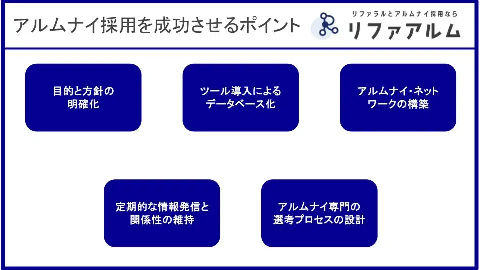アルムナイ採用を場当たり的なもので終わらせないための、戦略的な仕組みづくりにおけるポイントを紹介します。
