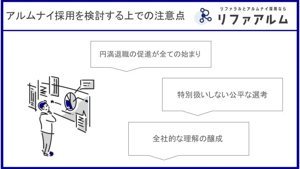 多くのメリットがある一方、アルムナイ採用には注意すべき点もあります。事前に対策を講じることで、デメリットを最小限に抑えましょう。具体的な内容について紹介します。