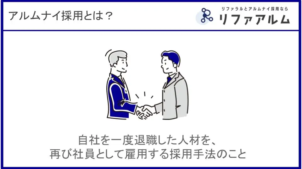 つまり、アルムナイ採用とは、自社を一度退職した人材を、再び社員として雇用する採用手法のことです。