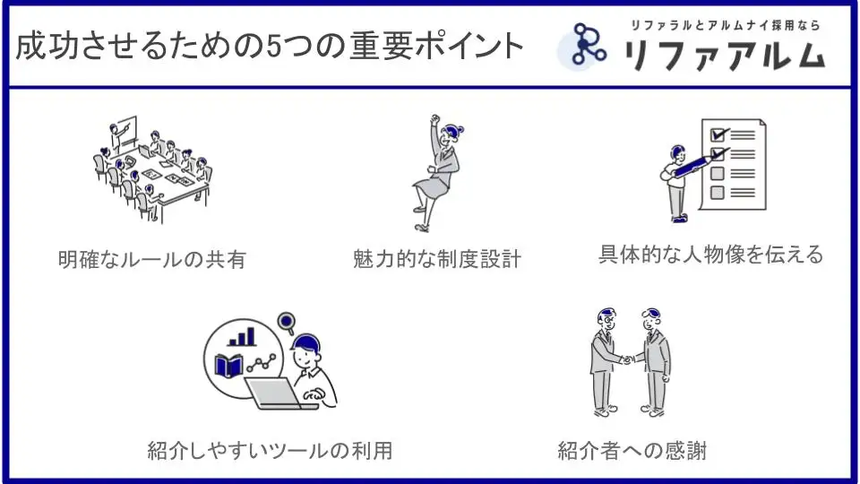 最後に、リファラル採用の効果を最大化するための5つのポイントをご紹介します。