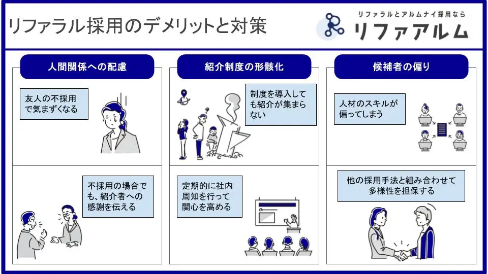 多くのメリットがある一方、リファラル採用には注意すべきデメリットも存在します。対策とセットで理解し、健全な制度運用を目指しましょう。