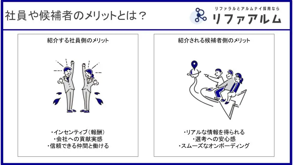リファラル採用を成功させるには、制度に関わる全員が「やってよかった」と思えることが重要です。企業だけではなく、社員側・候補者側にも以下のようなメリットがあります。