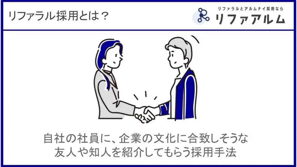 リファラル採用(Referral recruiting)とは、自社の社員に、友人や知人など、企業の理念や文化に合致しそうな人材を紹介・推薦してもらう採用手法のことです。「Referral」は「紹介・推薦」を意味します。