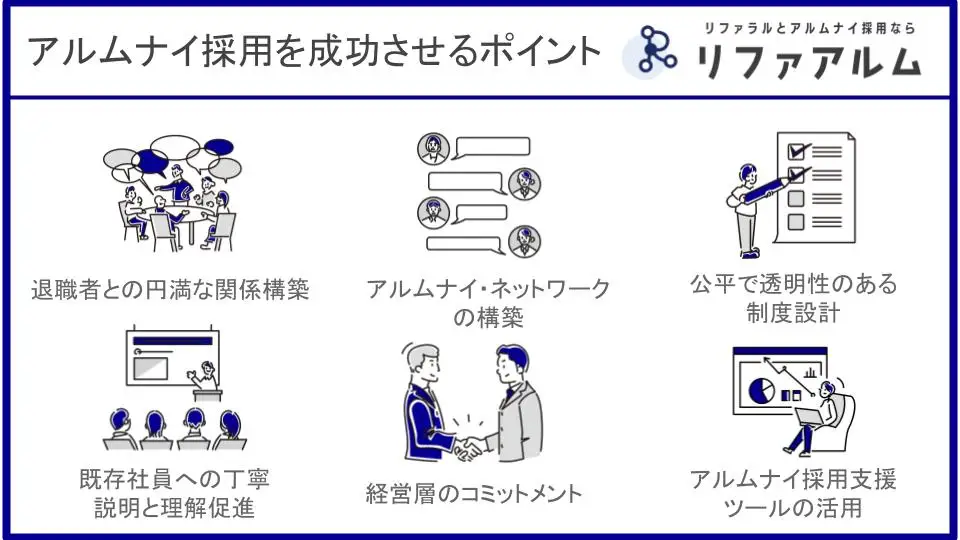ご紹介した成功事例には、いくつかの共通点があります。自社でアルムナイ採用を成功させるために、特に企業が意識すべき5つのポイントを解説します。