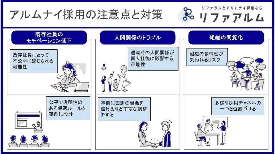 アルムナイ採用には多くのメリットがありますが、注意すべき点も存在します。事前に対策を理解しておくことで、リスクを最小限に抑えましょう。