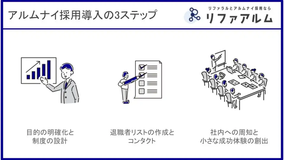 最後に、自社でアルムナイ採用を始めるための具体的な3ステップをご紹介します。まずはスモールスタートで構いません。