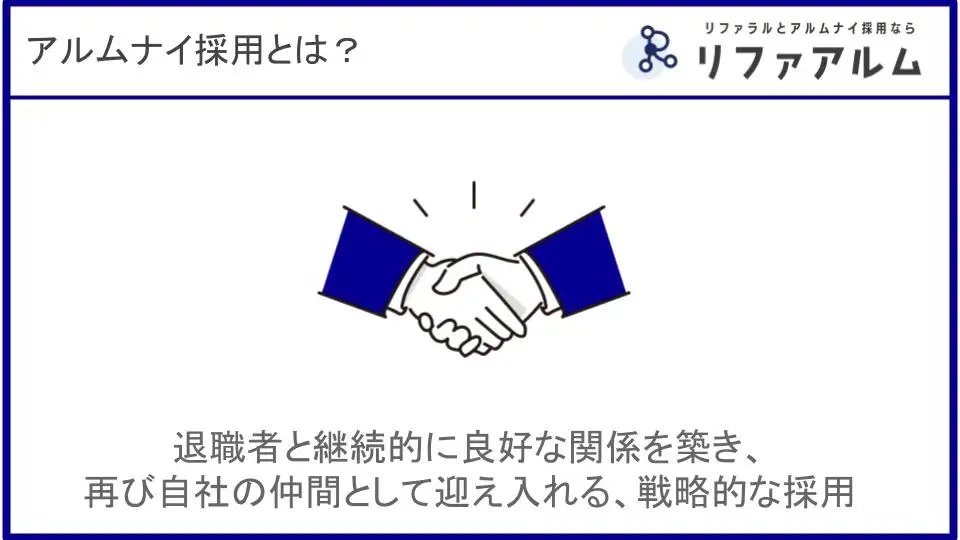 アルムナイ採用とは、企業が退職者を「卒業生」と捉え、退職後も継続的に良好な関係を築き、再び自社の仲間として迎え入れる、計画的・戦略的な採用活動のことです。