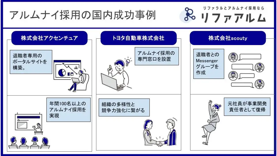 それでは、実際にアルムナイ採用を導入し、成功を収めている企業の事例を見ていきましょう。大手企業だけでなく、中小企業の事例もご紹介しますので、ぜひ自社の状況と照らし合わせながらご覧ください。