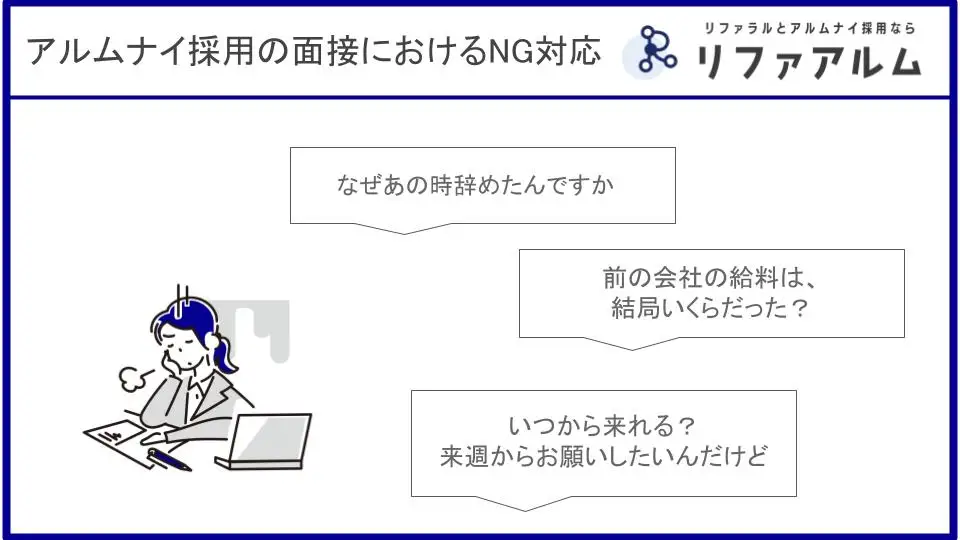アルムナイ採用の面接では、知人感覚が抜けずうっかり聞いてしまいがちなNG質問があります。これらは信頼関係を損ね、優秀な人材を逃すことにも繋がるため、絶対に避けましょう。