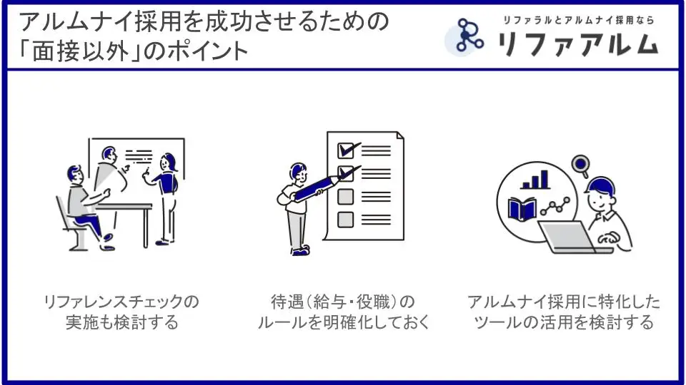 アルムナイ採用の面接そのものだけでなく、面接前後の「仕組み」を整えておくことも、アルムナイ採用の成功には不可欠です。