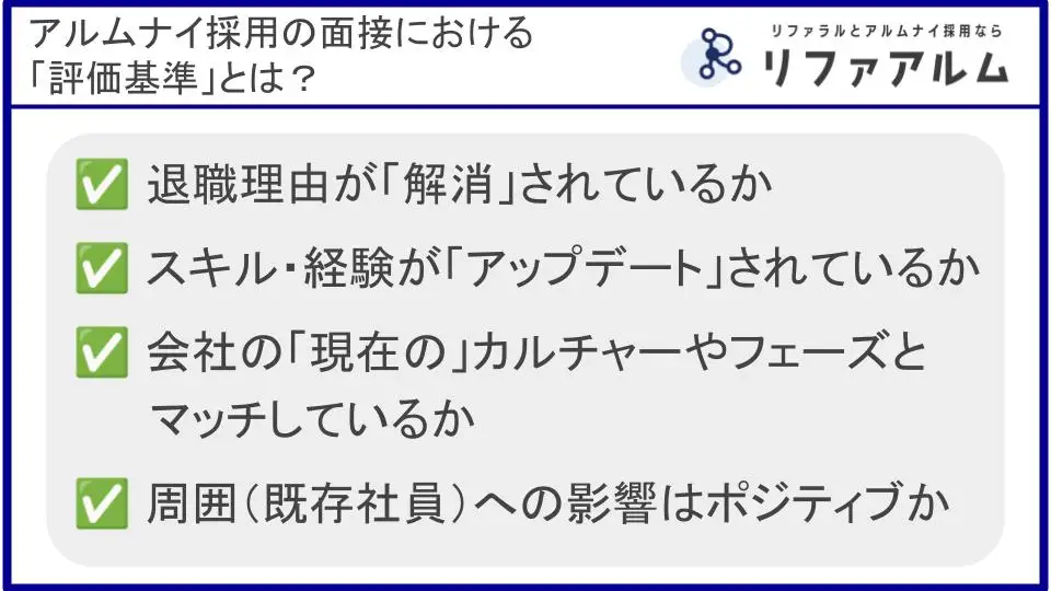 アルムナイ採用の面接が終わったら、客観的な基準で評価することがミスマッチを防ぐカギとなります。以下の4つのポイントで判断しましょう。