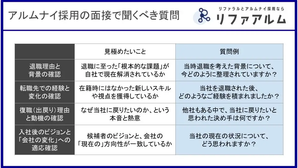 アルムナイ採用の面接は、単なる同窓会ではありません。以下の2点を見極める場であると、明確に定義することが大切です。