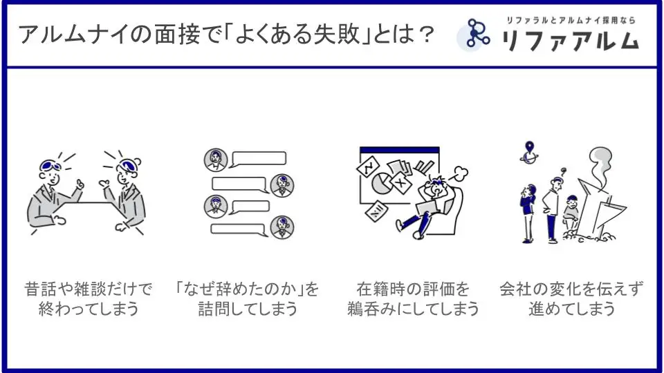 アルムナイ採用の面接は、お互いを知っているという安心感から、つい「雑談」や「昔話」に終始しがちです。しかし、それでは適切な評価はできません。まずは、よくある失敗パターンを把握しましょう。