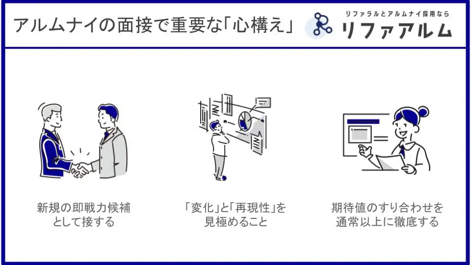 アルムナイ採用の面接での失敗を防ぐため、面接官(経営者・人事担当者)は以下の3つの心構えを持つことが非常に重要です。