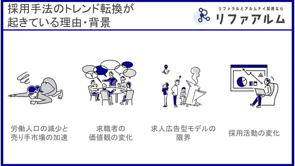 まず、なぜ従来の採用手法が通用しなくなり、新しいトレンドが生まれているのでしょうか。その背景には、主に4つの大きな変化があります。