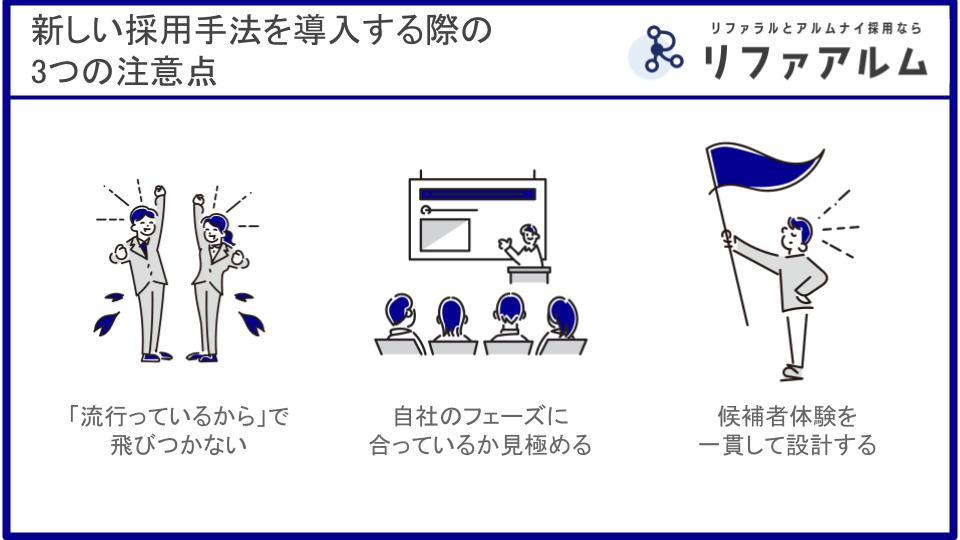 最も重要なのは、「なぜ、その手法を導入するのか」という目的を明確にすることです。「トレンドだから」という理由だけで飛びつくと、現場が混乱するだけで成果につながりません。「コストを削減したいのか」「ミスマッチを防ぎたいのか」「潜在層にアプローチしたいのか」など、自社の課題を明確にしましょう。