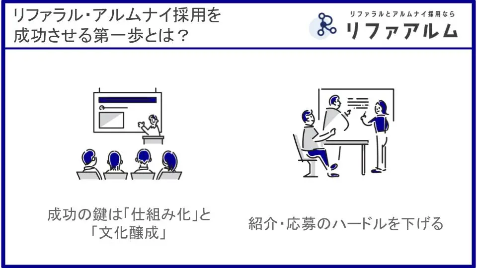 成功の鍵は、「仕組み化」と「文化醸成」の両輪を回すことです。 「誰に(紹介者)」「誰を(ターゲット像)」「何を(自社の魅力)」「どのように(紹介方法)」紹介してもらうかを明確にし、紹介のハードルを下げ、活動を可視化する「仕組み」が不可欠です。