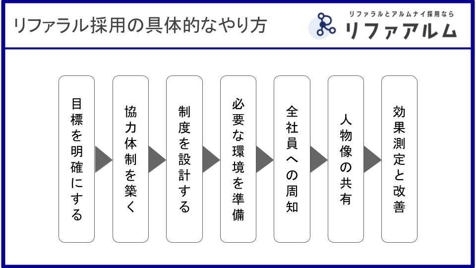 ここからは、リファラル採用を導入するための具体的な手順を7つのステップで解説します。このステップに沿って進めることで、制度の形骸化を防ぎ、効果的な運用を目指せます。