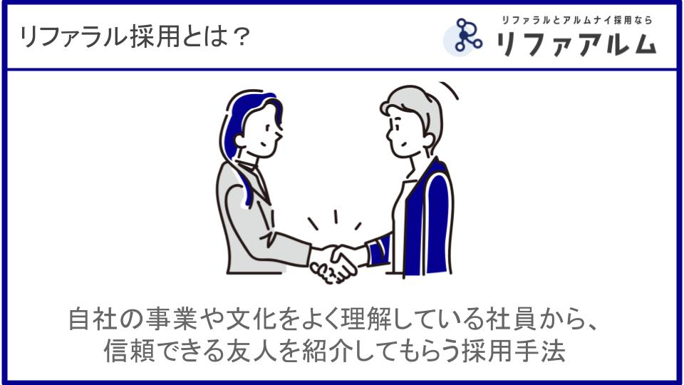 リファラル(referral)とは「紹介・推薦」を意味します。つまりリファラル採用とは、自社の事業内容や文化をよく理解している社員から、信頼できる知人・友人を紹介してもらい、選考を行う採用手法です。