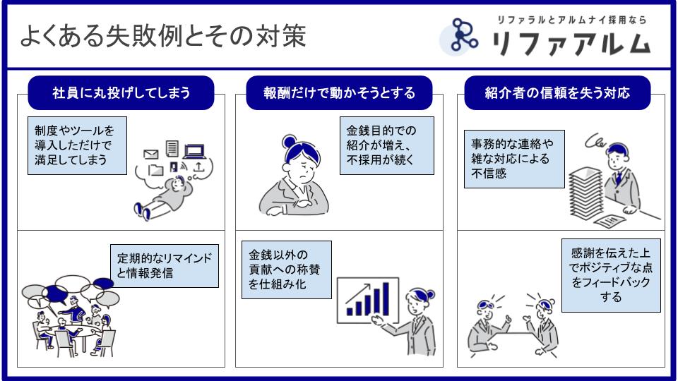 この失敗がもたらす弊害は、「金銭目的」で企業文化とのマッチ度を考えない紹介が増えることです。結果として、選考工数だけが増大し、不採用が続くと紹介者のモチベーションもかえって下がってしまうという悪循環に陥ります。