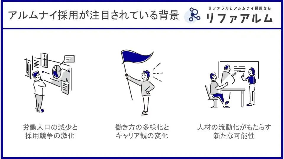 では、なぜ今、多くの企業がアルムナイ採用に注目し始めているのでしょうか。その背景には、大きく3つの社会的な変化があります。