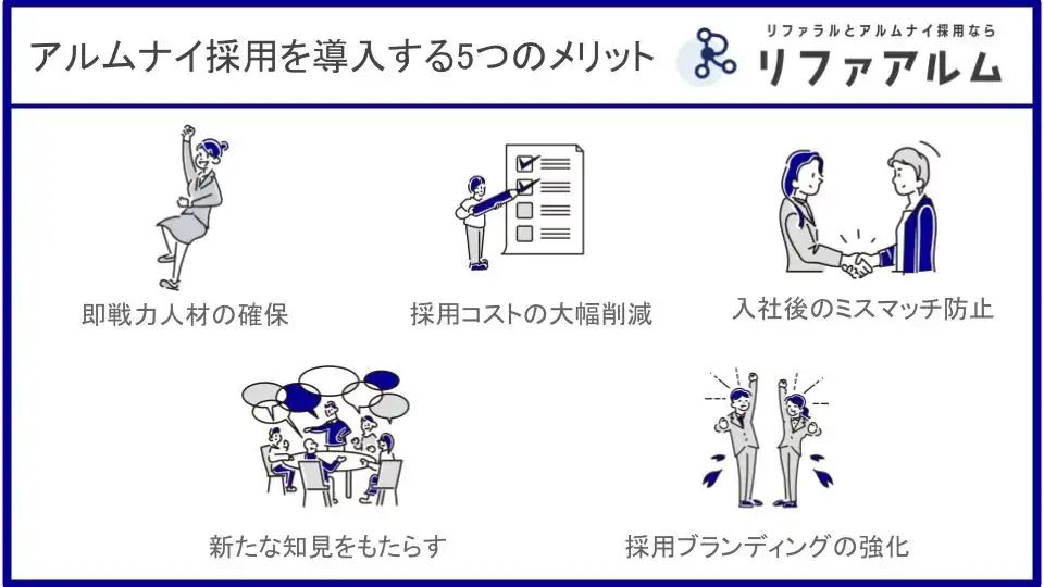 アルムナイ採用を導入することは、企業に多くのメリットをもたらします。ここでは代表的な5つをご紹介します。